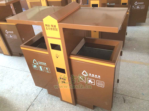 F238戶外分類垃圾桶,外桶為足1.2mm鍍鋅板,表面噴塑工藝,內(nèi)膽為201#,厚足0.75mm, 螺絲螺母為304不銹鋼材質(zhì),采用不銹鋼膨脹螺 安裝。噴塑顏色為土豪金色,垃圾桶開口位置坐折邊處理,箱體帶簡易防盜鎖。左右兩邊分別絲印,可回收物,其他垃圾等圖案標(biāo)志。中間橙黃色區(qū)域,印有美的·鷺湖森林度假區(qū),廢電池光碟字樣,字體顏色為土豪金色。欣方圳工程師采用金色的獨(dú)特性的設(shè)計風(fēng)格,特別受到物業(yè),房地產(chǎn),機(jī)場,小區(qū)等單位的青睞。