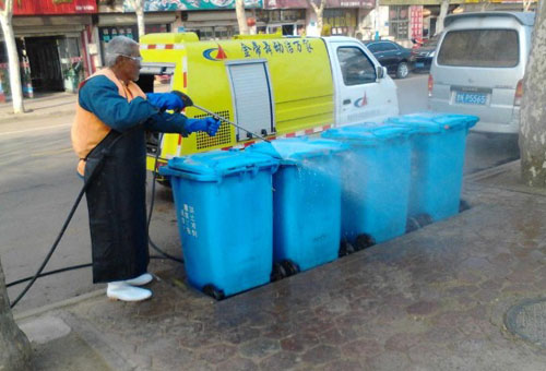 洗桶車自帶清水4.5噸,可一次清洗250個垃圾桶,洗下來的污水還能存在車內,絕對不造成污染。
