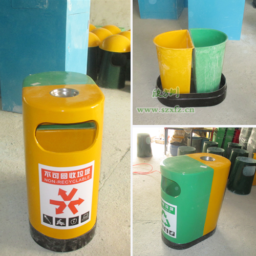 深圳寶安沙井實驗學校,是欣方圳老顧客了。按照之前訂購的玻璃鋼垃圾桶樣板生產,發實物照給工廠的廠長確認。A21玻璃鋼環保分類垃圾桶的規格為:680*400*850mm.這款垃圾桶來頭可不小哦,它是獲得了專利外觀設計的玻璃鋼垃圾桶。每個產品是經過的嚴格生產程序制造出來,貼上產品合格證,符合企業高品質標準。玻璃鋼垃圾桶一邊嫩綠,一邊中絡黃,底座黑色,外加一個煙灰缸巧妙的搭配,簡潔、美觀。桶蓋/桶身采用FRP玻璃鋼復合材料制造,具有防腐、防盜、防生銹、易清潔等特點,表面涂層采用高分子耐老化膠衣涂層,色澤明快、持久。