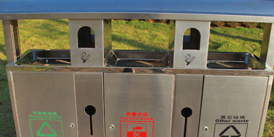 戶外不銹鋼三分類果皮箱現場安裝擺放圖