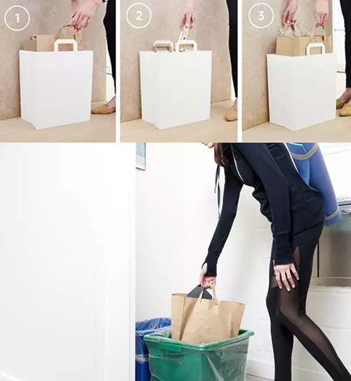 它的正確使用方式是搭配上購物紙袋,這一點和我們的習慣似乎不太一樣,也許是因為美國購物時使用紙袋更多,勤儉持家的家庭主婦們將這些紙袋用作垃圾袋,可是紙袋不夠牢固,放上東西便會東倒西歪,有這樣一個垃圾桶正好解決問題,其實它的外形也和購物紙袋有些相似呢。當然,將紙袋換成我們習慣的塑料袋,照樣可以優雅地裝垃圾。它有黑白兩色可選,放在辦公室、廚房均可。