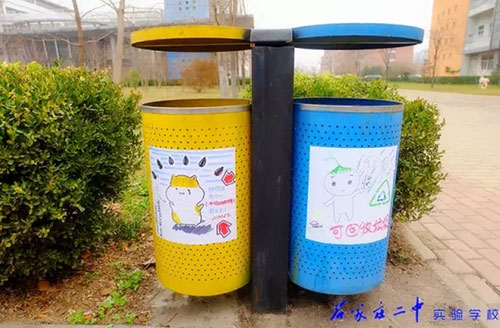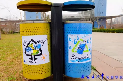 2016年3月18日,石家莊二中實驗學校2015級高一11班全體66名同學利用班級值周的時間,手繪百幅垃圾分類標志,為校園垃圾桶換上了“新裝”。18日上午,高一11班教室內(nèi),66位同學拿起五顏六色的水彩筆,在紙張上設(shè)計出各種各樣的“垃圾分類”標識和警示語,內(nèi)容涵蓋了分類標志、垃圾擬人、科普漫畫等,圖面生動有趣。次日下午,同學們又從教室奔向校園每個角落,將精心繪制的圖案張貼在校內(nèi)所有的垃圾桶上,提醒過往師生將垃圾分類,維護我們共同的家園。