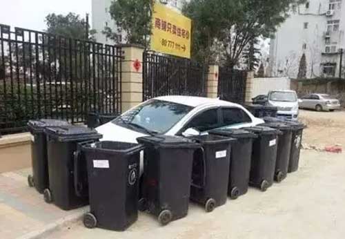垃圾桶不用來裝垃圾,卻被拿來“圍堵綁架”小轎車