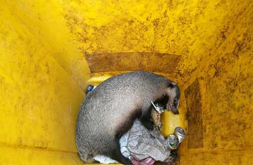 現場據周某稱,她一早來收垃圾桶,突然發現該垃圾桶內竟有一只兇猛怪異的動物,見來人靠近,立即瞪眼張嘴,做出要咬人的樣子,因該垃圾桶靠近山體,桶內很深,懷疑是該動物從山上掉落后無法爬出。現場查看,該動物肚大腰圓,貌似已懷孕。現場有小區居民稱,小區緊鄰獅子山,一邊更有護城河,環境極佳,經常見到不少小型的野生動物出沒,但該動物外貌奇特,他們從未見過,不知到底啥物。初步判斷,應是在山上找食時,不慎掉落桶內。