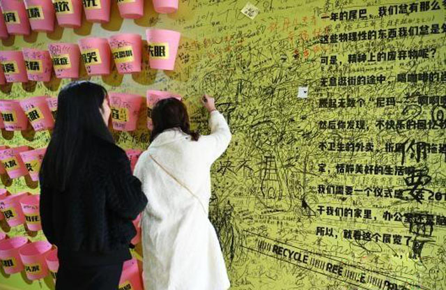 除了這些垃圾收集裝置,垃圾箱內(nèi)的三面?zhèn)葔偷孛嬉渤蔀槭忻裥沟钠脚_(tái),寫(xiě)滿(mǎn)了戳心的留言。如“扔掉和我媽的溝通不暢”“2018我抑郁癥了,話(huà)更少了,希望你不要離開(kāi),一起去馬來(lái)西亞”……字字句句都反映出當(dāng)代年輕人的生活壓力,以及對(duì)輕松、快樂(lè)的渴望。