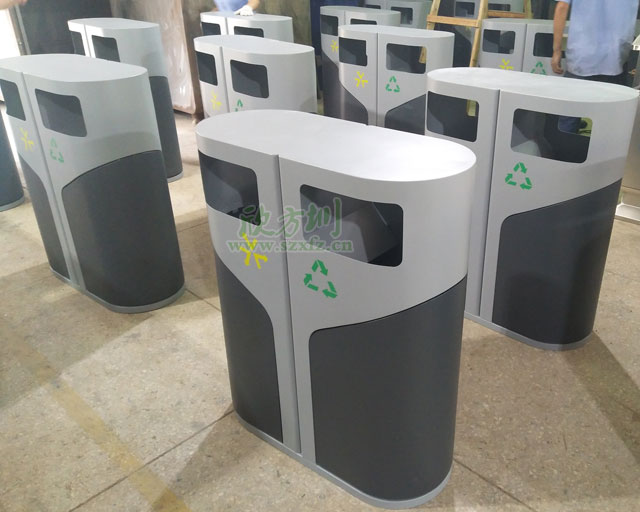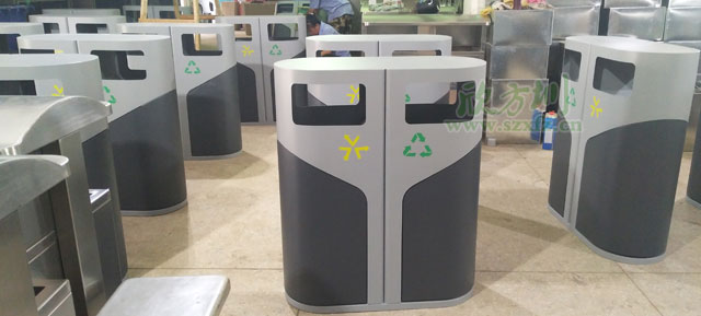 • 產品材質:欣方圳側開門鋼制分類垃圾桶采用優質冷軋鋼材料經剪鈑下料、折彎、沖壓、焊接、打磨、等工藝:表面經過除油、噴砂防銹處理后,再進行酸洗磷化處理;表面清理干燥后整體進行靜電噴涂或烤漆處理,靜電噴涂是經過流水線高溫固化爐固化后再出爐冷卻,加工后的塑粉附著力強,不易剝落;