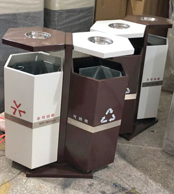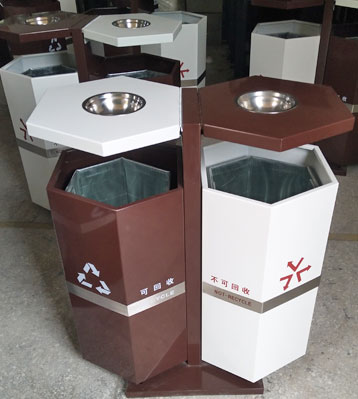 六角設計創意美觀,采用優質冷軋鋼板一次沖壓成型整體堅固耐用,咖啡色和白色戶外粉高溫烤漆防銹防腐蝕能力強,交錯搭配有助垃圾分類投放。