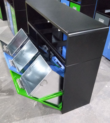 • 產品材質:街道戶外三分類垃圾回收箱采用優質冷板噴塑,足0.8mm厚度外筒,鍍鋅板內筒0.4mm,貼戶外噴繪高檔美觀,可按不同地區垃圾分類要求,絲印可回收物(RECYCLABLE WASTE)、有害垃圾(HAZARDOUS WASTE)、濕垃圾(HOUSEHOLD FOOD WASTE)、干垃圾(RESIDUAL WASTE)等分類標。