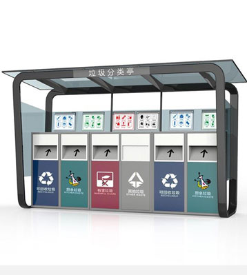 設有擋雨棚,可配備垃圾箱信息顯示屏、防水照明燈、廣告屏,進行地面硬化。對社區玻金塑紙可回收物,其他垃圾,廚余垃圾,有害垃圾等生活垃圾定時定點投放收集.