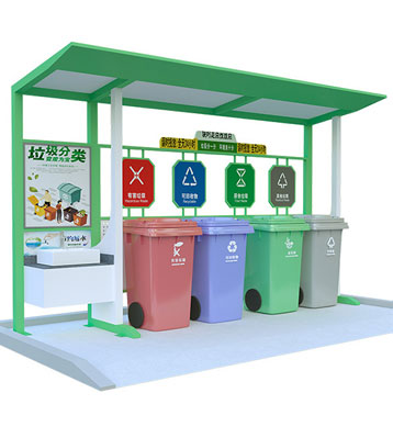 設有擋雨棚,可配備垃圾箱信息顯示屏、防水照明燈、廣告屏,進行地面硬化。對社區玻金塑紙可回收物,其他垃圾,廚余垃圾,有害垃圾等生活垃圾定時定點投放收集.