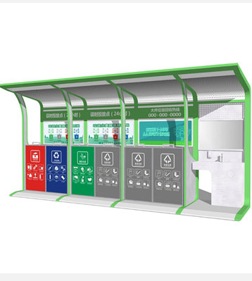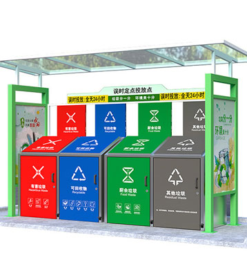 設有擋雨棚,可配備垃圾箱信息顯示屏、防水照明燈、廣告屏,進行地面硬化。對社區玻金塑紙可回收物,其他垃圾,廚余垃圾,有害垃圾等生活垃圾定時定點投放收集.