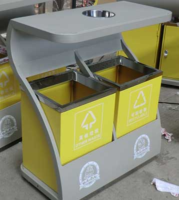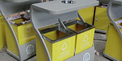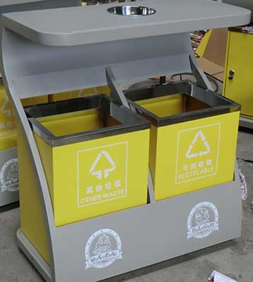 • 產品材質:欣方圳戶外分類垃圾桶采用優質冷軋鋼材料經剪鈑下料、折彎、沖壓、焊接、打磨、等工藝:表面經過除油、噴砂防銹處理后,再進行酸洗磷化處理;表面清理干燥后整體進行靜電噴涂或烤漆處理,靜電噴涂是經過流水線高溫固化爐固化后再出爐冷卻,加工后的塑粉附著力強,不易剝落;