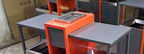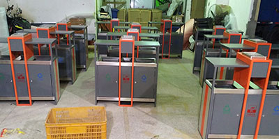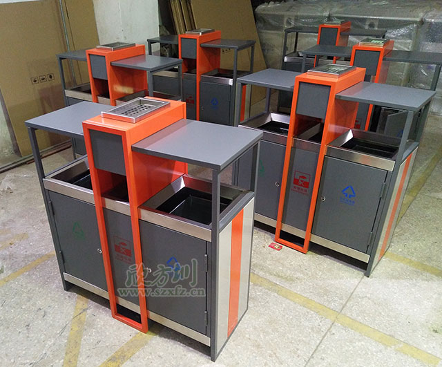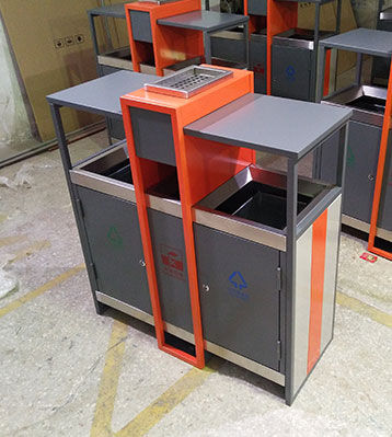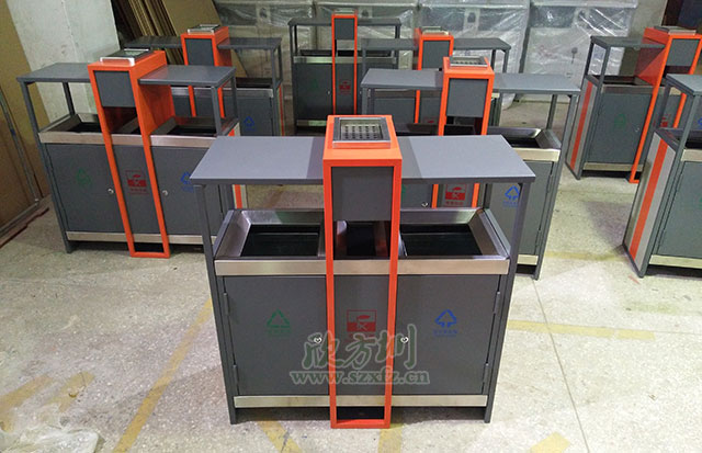 欣方圳戶外鋼制分類烤漆垃圾桶表面經過除油、噴砂防銹處理后,再進行酸洗磷化處理;表面清理干燥后整體進行靜電噴涂或烤漆處理.。